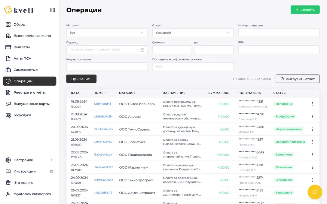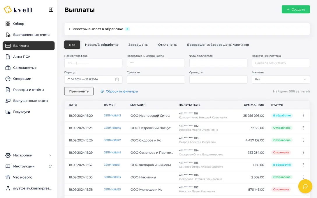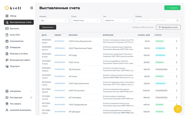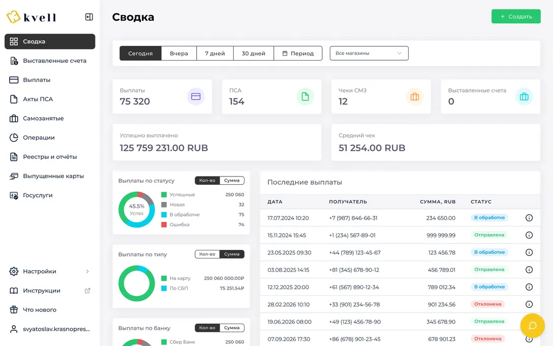 Используйте личный кабинет KVELL, чтобы:- регистрировать самозанятых