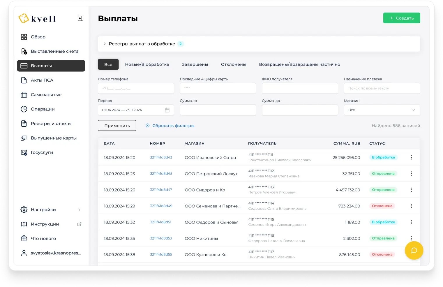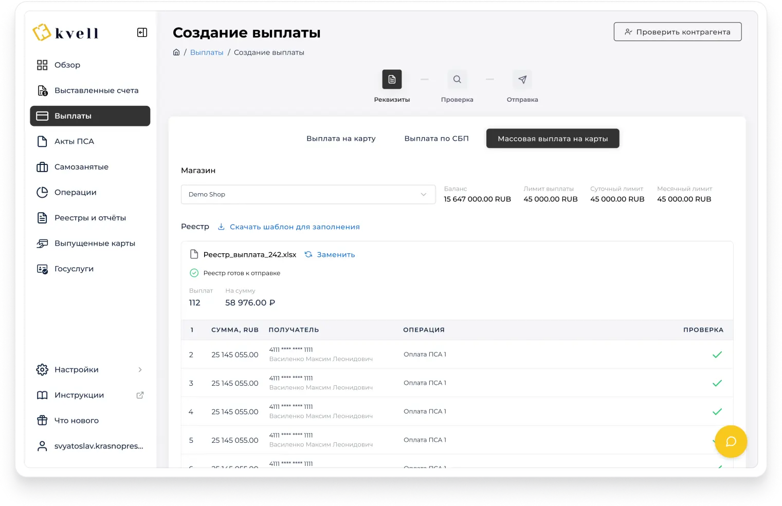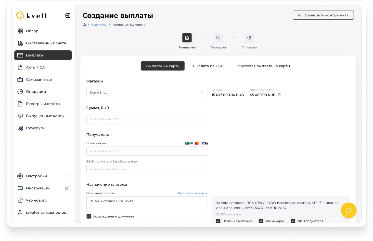Alıcının tam banka bilgileri ve yorucu fatura işlemleri yerine telefon ya da kart numaralarını kullanarak toplu ödeme yapın. İş ortaklarıyla grup mutabakatları için evrensel bir yöntem kullanın ve para gönderirken hataları azaltın.Operasyon maliyetlerini artırmadan KVELL ile ödeme hacmini büyütün!